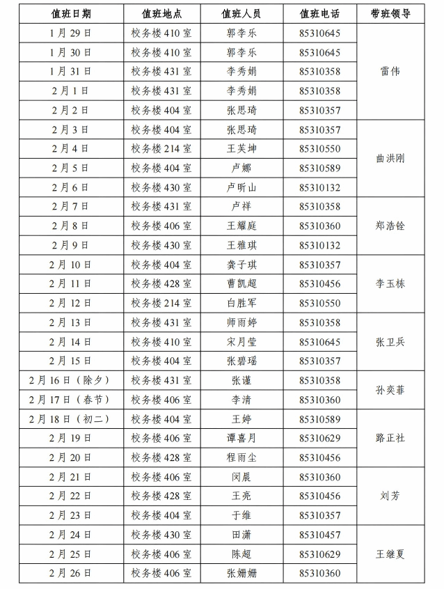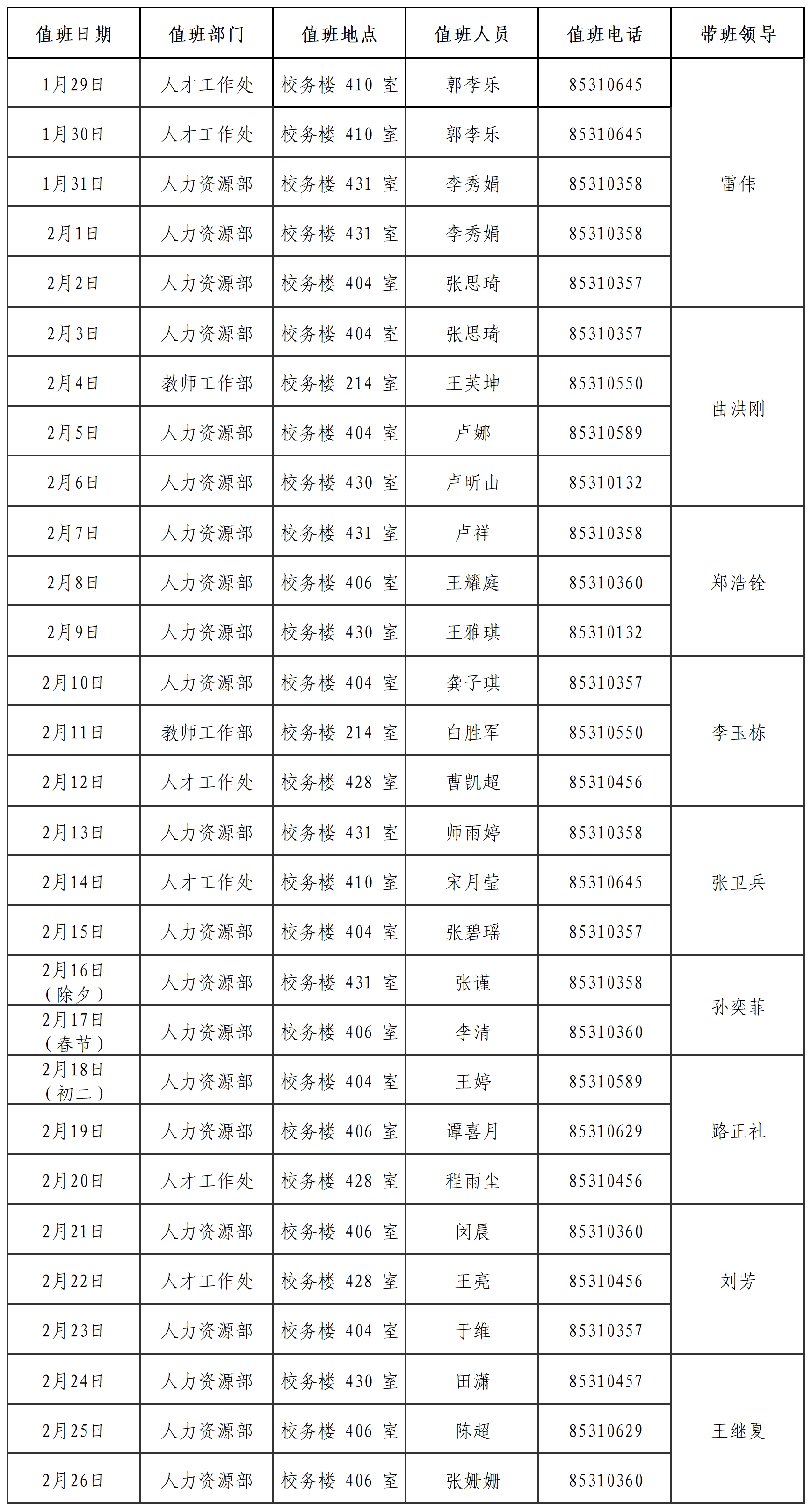 人才工作处、人力资源部、教师工作部2026年寒假值班安排表
